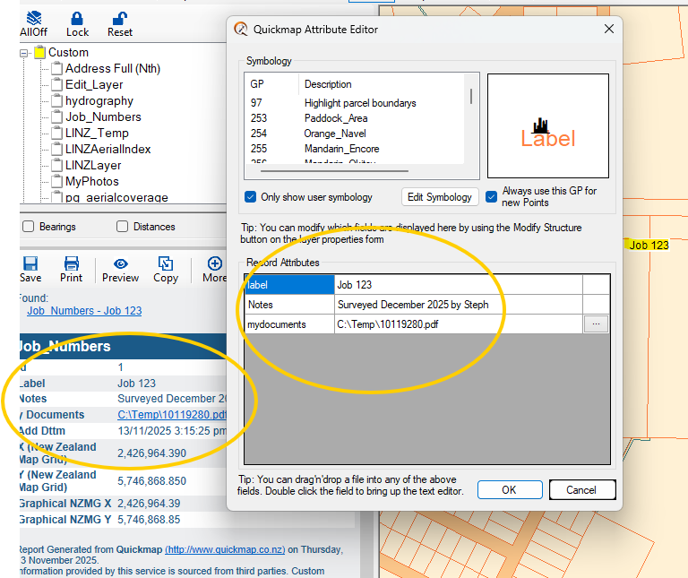 You can add your own data into Quickmap. Below is an example of how to add single data points, such as Job numbers and documents, into a new Quickmap layer