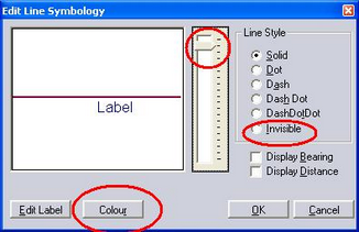 Edit Line allows you to modify the line colour, width and line style. Line styles may be set to Solid, Dot, Dash, Dash Dot or Dash Dot Dot. Only solid line styles may have a line width greater than one. The Invisible option makes the Line invisible but enables a label to be placed in that location.