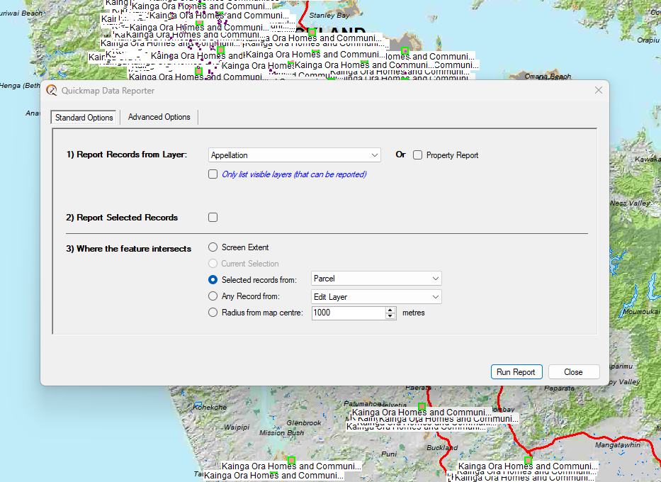 Select the report you wish to run from the Report Records from Layer drop-down list. The most common report is the Appellation Report, which reports property information. You can quickly select this by ticking the Property Report checkbox.