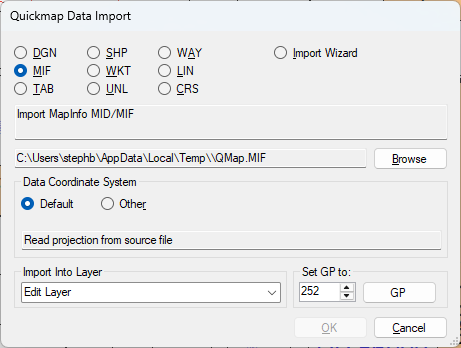 | WAY | Supported for import. The WAY file is an ASCII Vector format file. If your GPS does not support NMEA protocol, or cannot download waypoints using NMEA then you can still download the data from your GPS unit by Importing a waypoint file.To download waypoints from a waypoint file: Download GPS TrackMaker from www.gpstm.com (this software will support almost every GPS unit interface). Using this free software save your GPS data as a waypoint file. From Quickmap select File>import and you will be presented with the following import box that will enable you to browse to your waypoint file and then import it. |